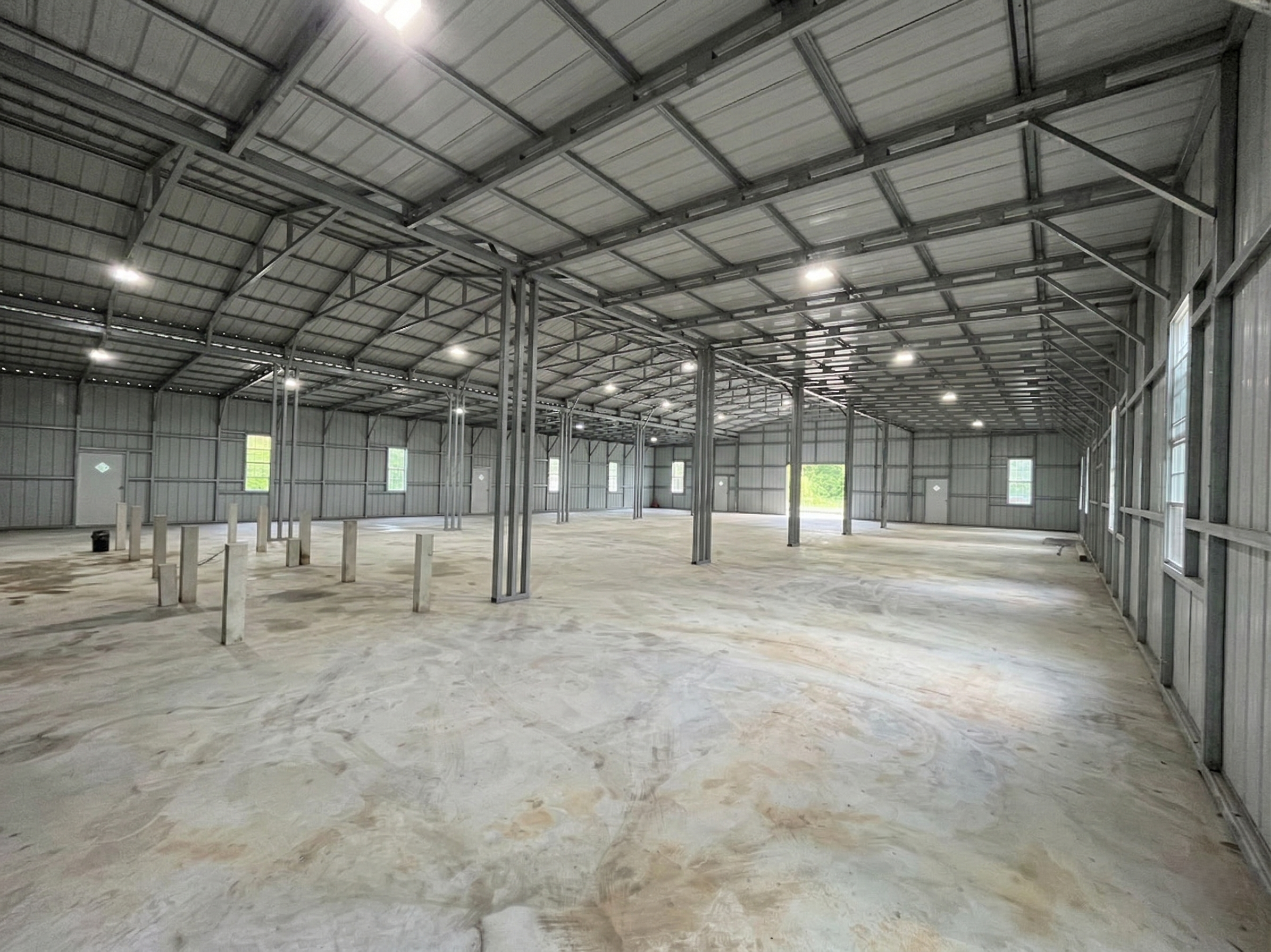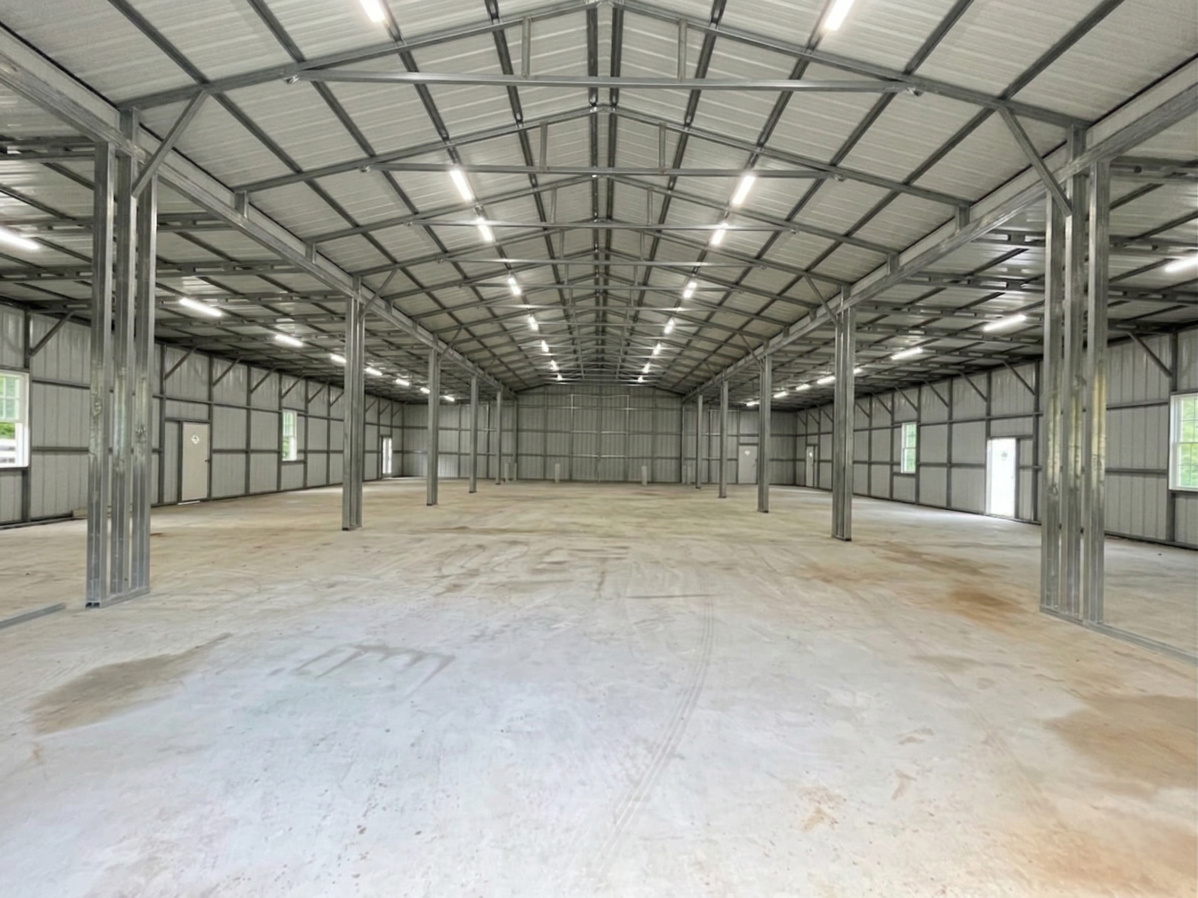 70x90x15/14 Certified A-Frame all vertical commercial barn with 2 lean-to’s 20x90x14, 6 windows, 6 walk in doors, 1 10×10 roll up door